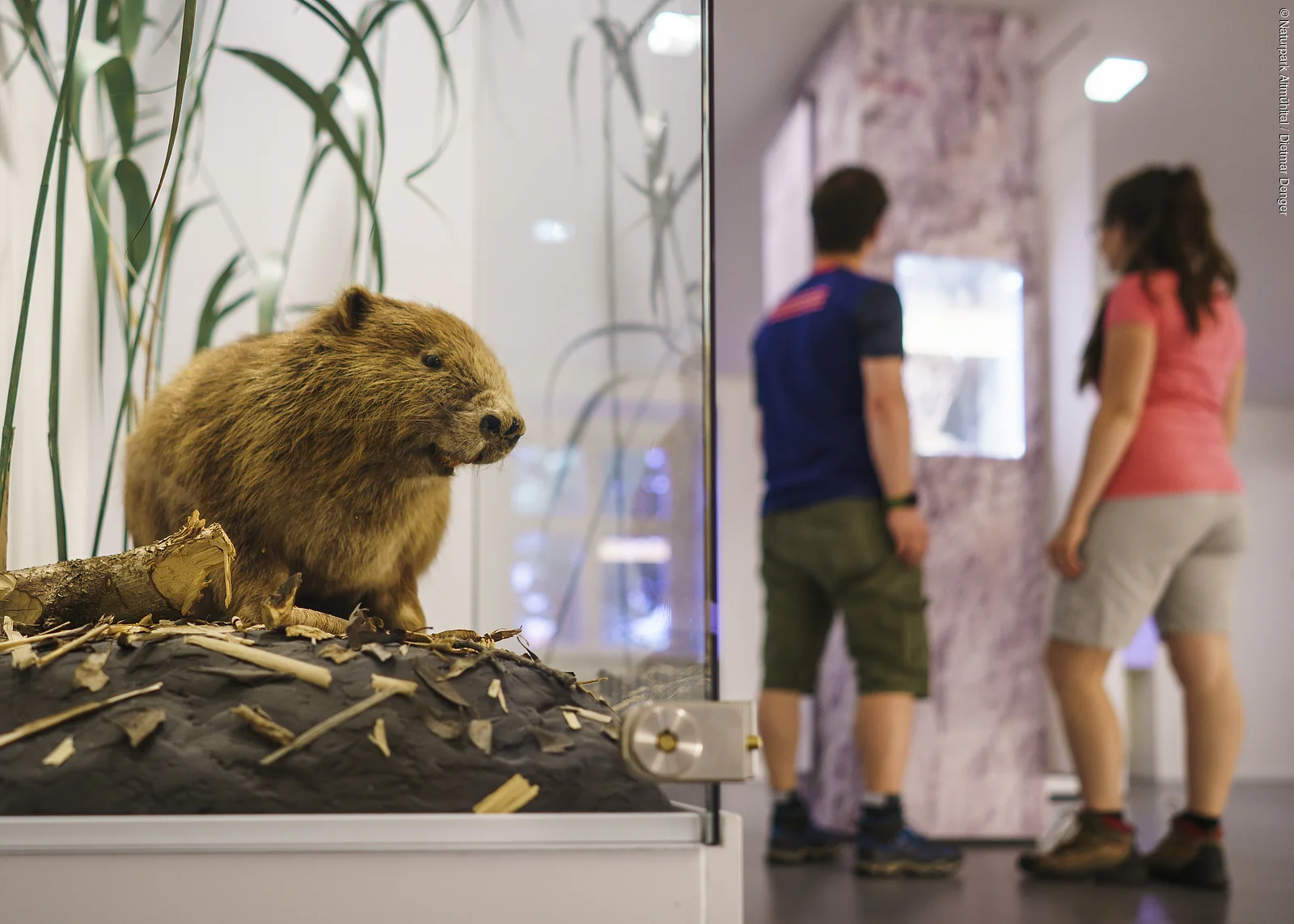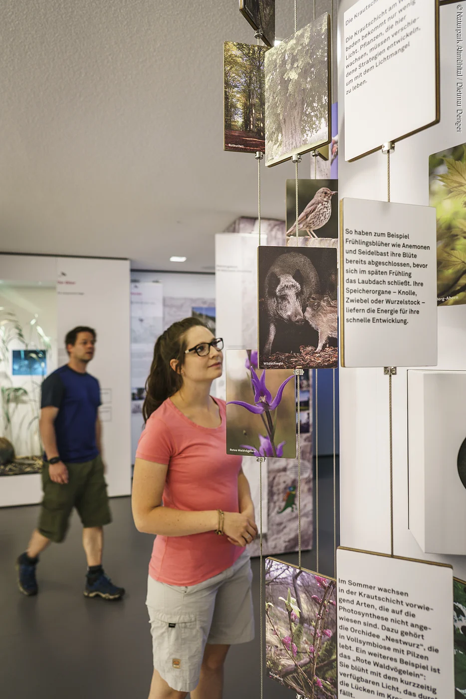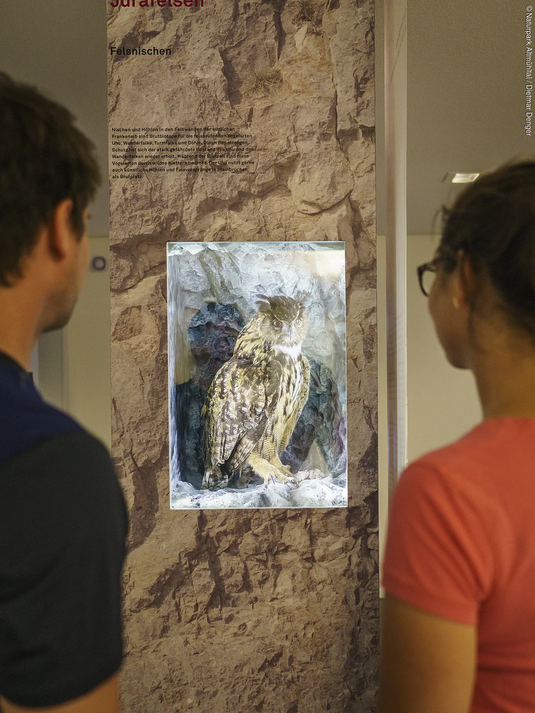 Über zwei Stockwerke erstreckt sich die Ausstellung, die klassische Elemente mit vielen Stationen zum Hören, Fühlen und Entdecken verbindet. Im ersten Stock des Informationszentrums spaziert man durch die Naturlandschaft des Naturpark Altmühltal und entdeckt selbstverständlich auch, was sich alles in dieser herrlichen Natur erleben lässt. Dabei wagt man einen Blick tief hinab in das Innere einer Doline oder entspannt beim Plätschern einer „Steinernen Rinne“.