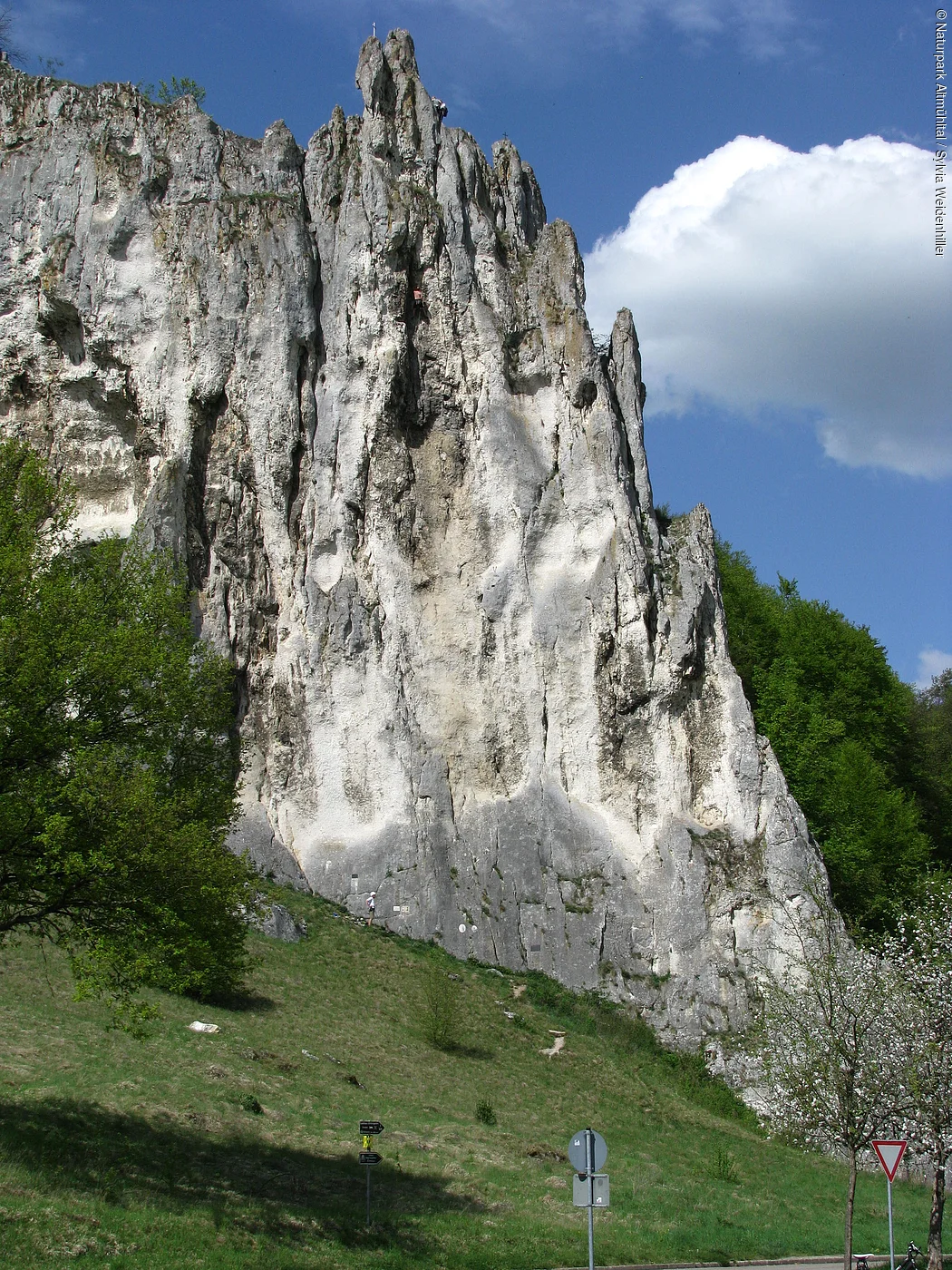 Die Felsenpartie am nördlichen von Trockenrasen bedeckten Hang des Urdonautales ragt ca. 70 m auf. Die hell leuchtenden Felsbastionen - heute ein vielbesuchtes Kletterparadies - sind vor etwa 150 Millionen Jahren, im Erdzeitalter des Weißen Jura (Malm), entstanden.