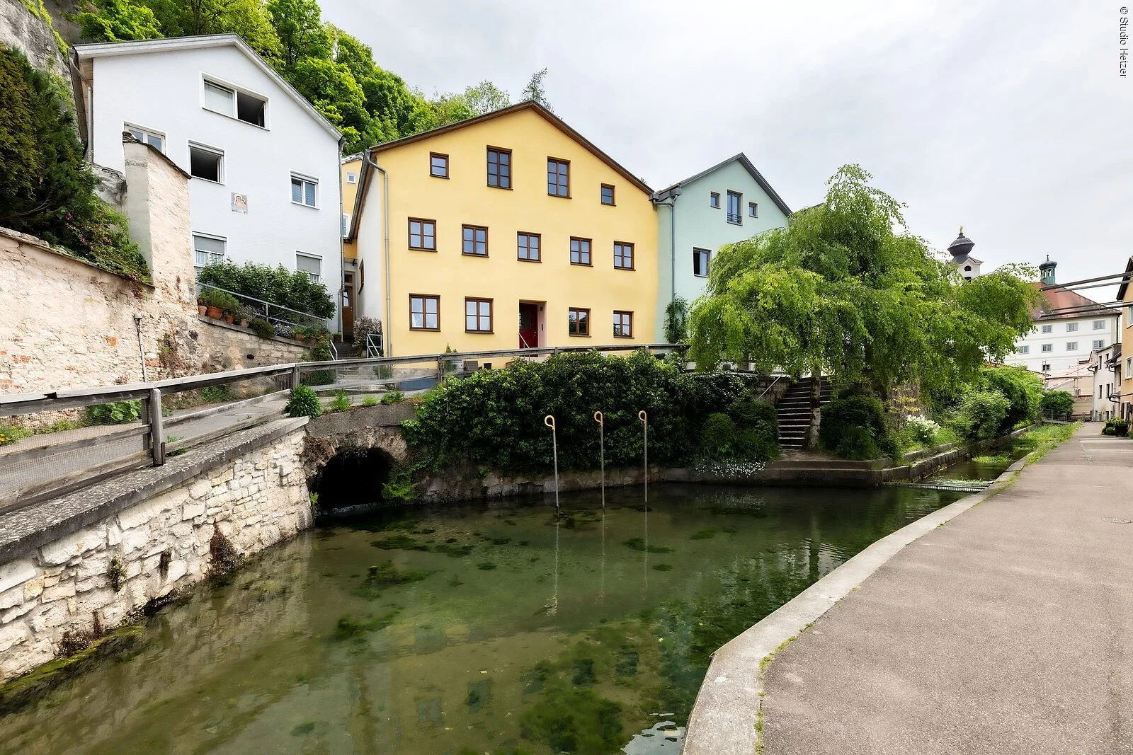 Die Quellschüttung beträgt 150 bis 250 Liter in der Sekunde. Die Häuserzeile längs des Baches - die linke schmiegt sich oben an den Felsenhang, die rechte säumt tief darunter den Bachlauf, bilden zusammen mit dem Bach ein reizendes Idyll. Der Kapellenbach ist mit Kalksteinmauern eingefasst, an denen Zymbelkraut, ein wärmeliebender Besiedler von Mauerspalten, wächst. Nach ca. 350 m fließt der Bach in die Altmühl, etwa 50 m vor der Mündung (vom Ritter-von-Hofer-Weg einsehbar) vereinigt sich der Kapellenbach mit dem Bett seines geheimnisvollen Bruders , des Edelbachs. Dieser stürzt - allerdings meist nur bei der Schneeschmelze oder bei lang dauernden Regenperioden - im Hof des Klosters St. Walburg in einem acht Meter hohen Wasserfall aus einem Felsen. Seine Wassermassen strömen im Berginnern aus Seitenspalten in einen Hauptgang, in dem sich im Laufe der Jahrtausende große Tropfsteine gebildet haben. Der Sage nach soll der Edelbach einst sein Tor sprengen und mit einer Wucht herausströmen, die Kloster und Stadt vernichten würde. Der Bach trieb mehrere Mühlen. Das 1496 erbaute Gebäude der Walburgismühle (Westenstraße 52) ist noch erhalten. Die Mühle wurde bis 1959 betrieben. Ein Mühlrad ist noch von der Westenstraße aus zu sehen und dient heute der Stromgewinnung.