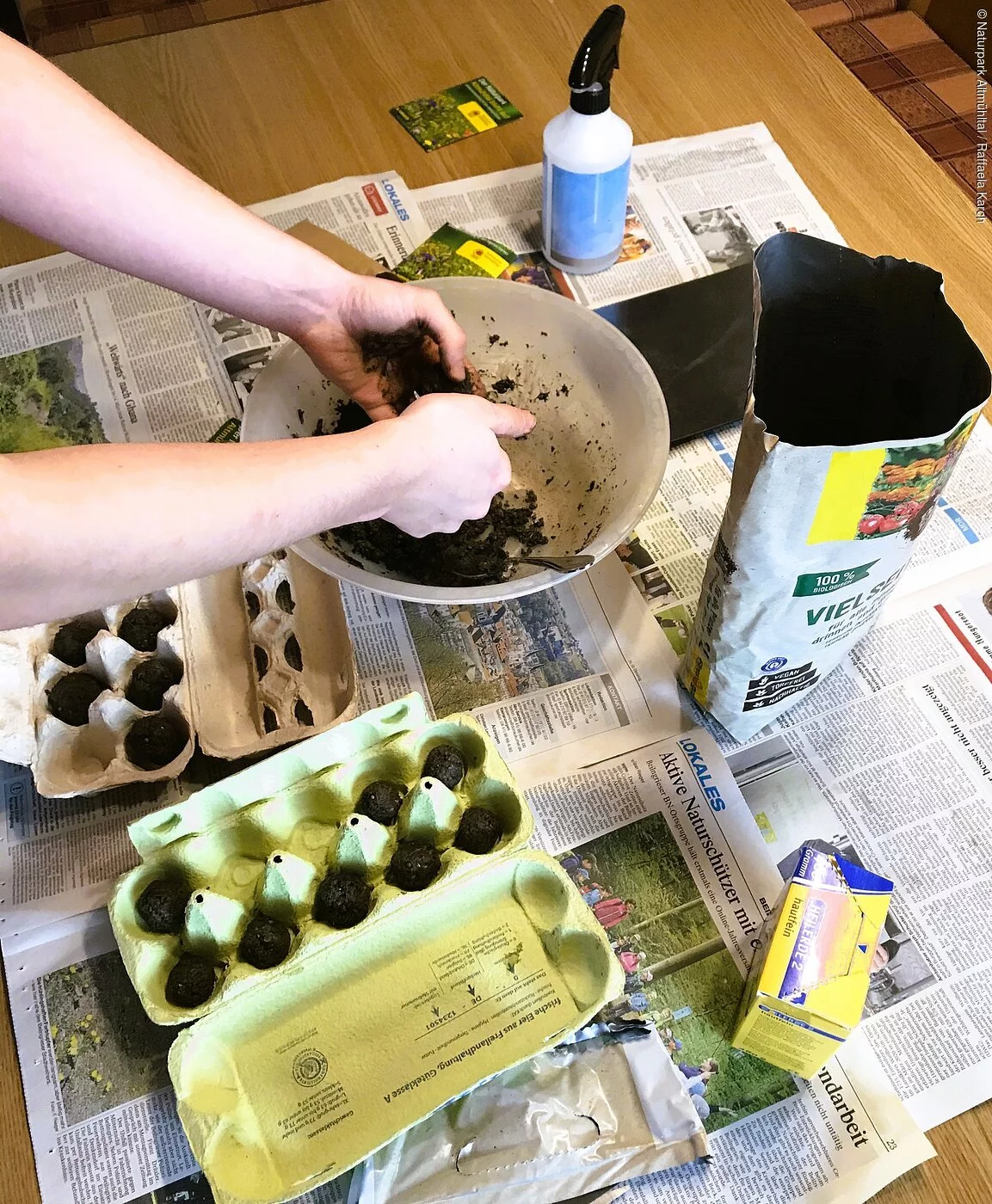 Auf einem Tisch stehen Samen, Wasser, Erde und Eierkartons. Mittig ist eine Schüssel platziert, in der zwei Hände Samenbomben formen.