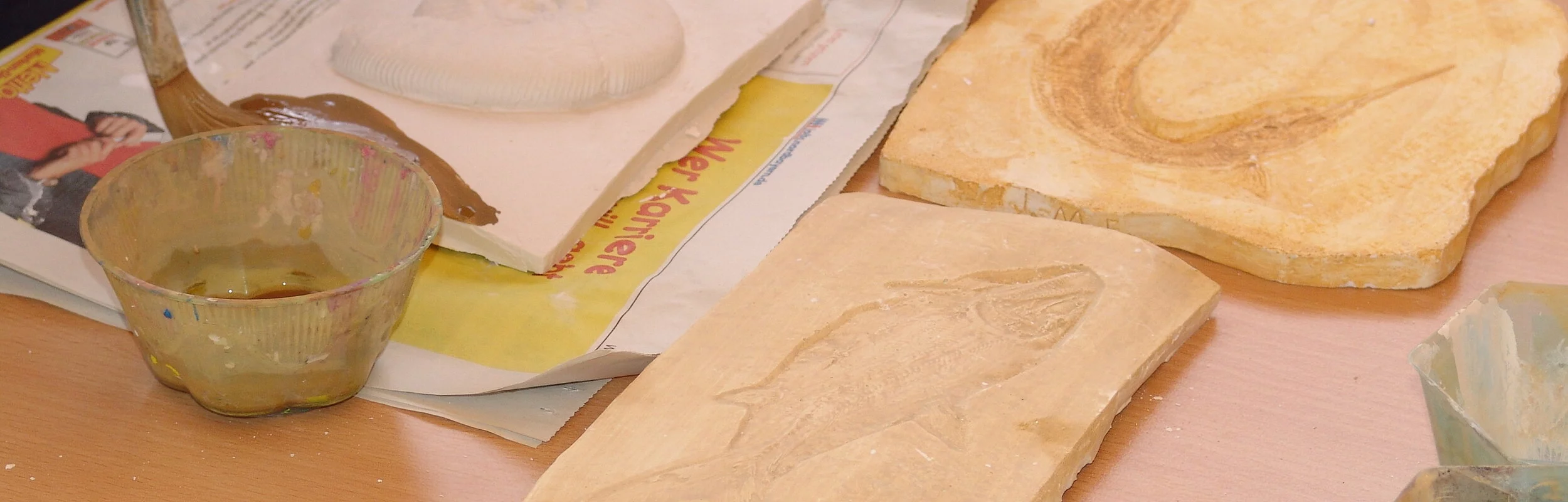 Nicht nur die Entstehung von Fossilien ist spannend, sondern auch das Fälschen eines eigenen Fossils macht riesig Spaß! Zum Beispiel bei einem Kreativgeburtstag! In unserer Fälscherwerkstatt erstellen wir eigene Fossilien, die natürlich mit nach Hause genommen werden können. Mit den echten Solnhofener Platten werden zusätzlich Deko-Elemente wie z.B. Pflanzen- und Namenschilder gebastelt.